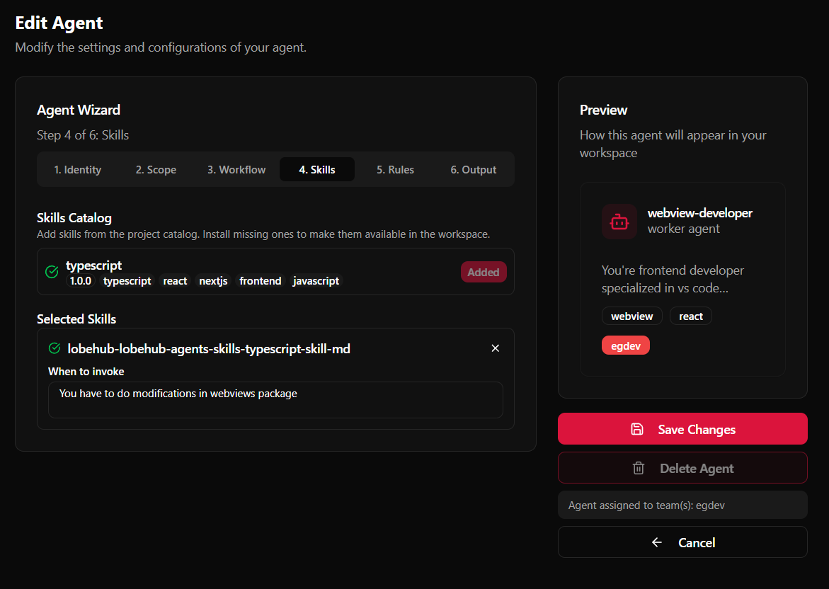 También puedes asignar skills durante la creación inicial del agente — el mismo paso de skills aparece en el wizard de creación.
