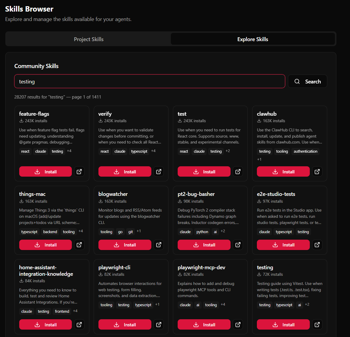 • Haz clic en Install en cualquier tarjeta para añadirla al skills.registry.yml de tu proyecto