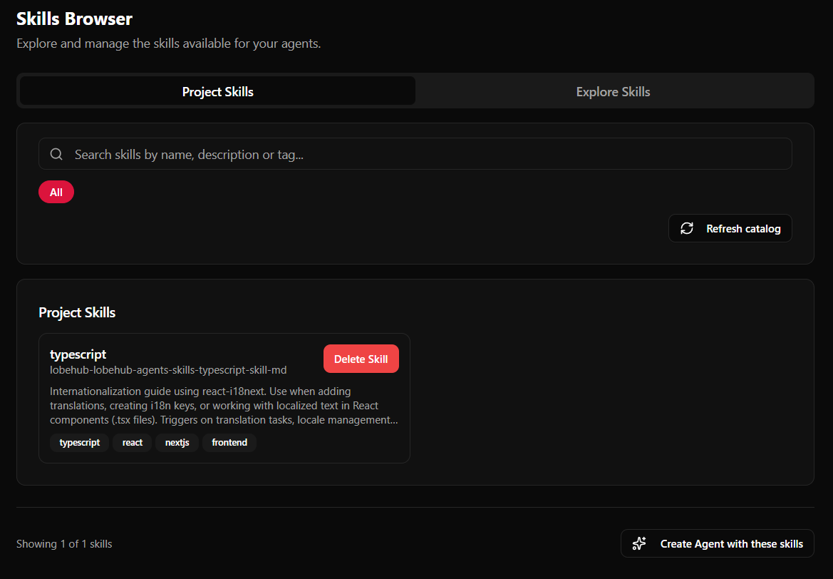 • Refresh — recarga el catálogo de skills desde disco